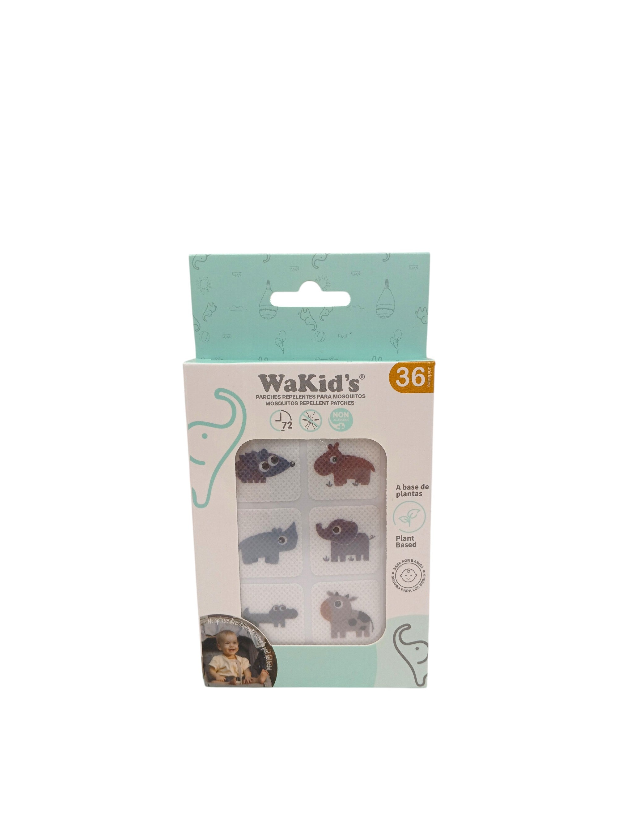 • Parches repelente de mosquitos Wakids. • A base de aceite escencial de citronella, eucalipto, menta e hierva de limón. • Fragancia duradera. • Durabilidad de hasta 72 horas. • No toxico. • 36 unidades.