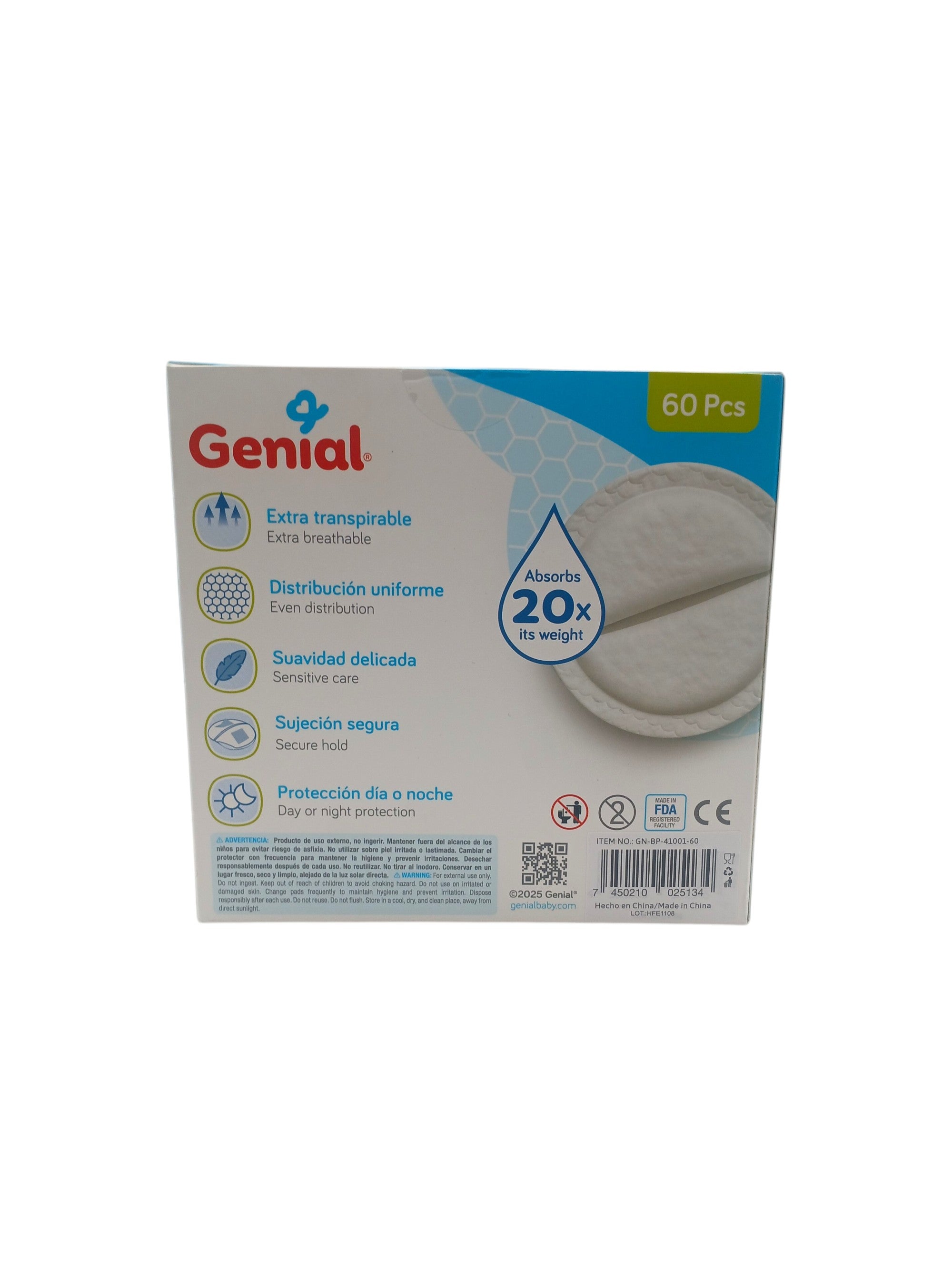 Marca: GenialColor: Blanco.Peso neto: 0,335 Kg. Peso bruto: 0, 340 Kg.Dimensiones de producto: 15 X 13 X 15 centímetros.Dimensiones de empaque: 15,5 X 13,5 X 15,5 centímetros.• Protectores de lactancia.• Incluye 60 piezas.• Textura tipo panal.• Suave, impermeable, discreto.• Extra transpirable.• Distribución uniforme.• Sujeción segura.