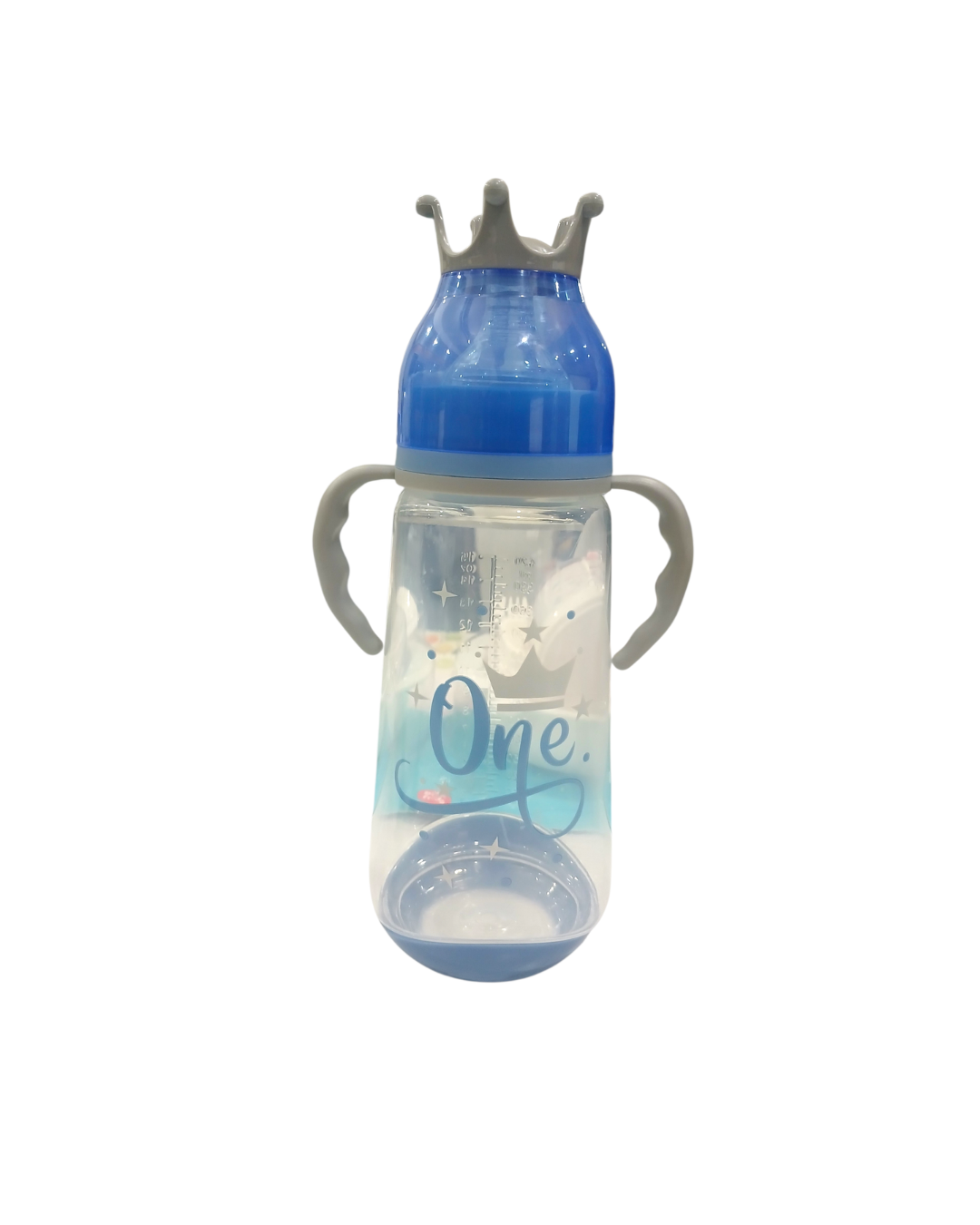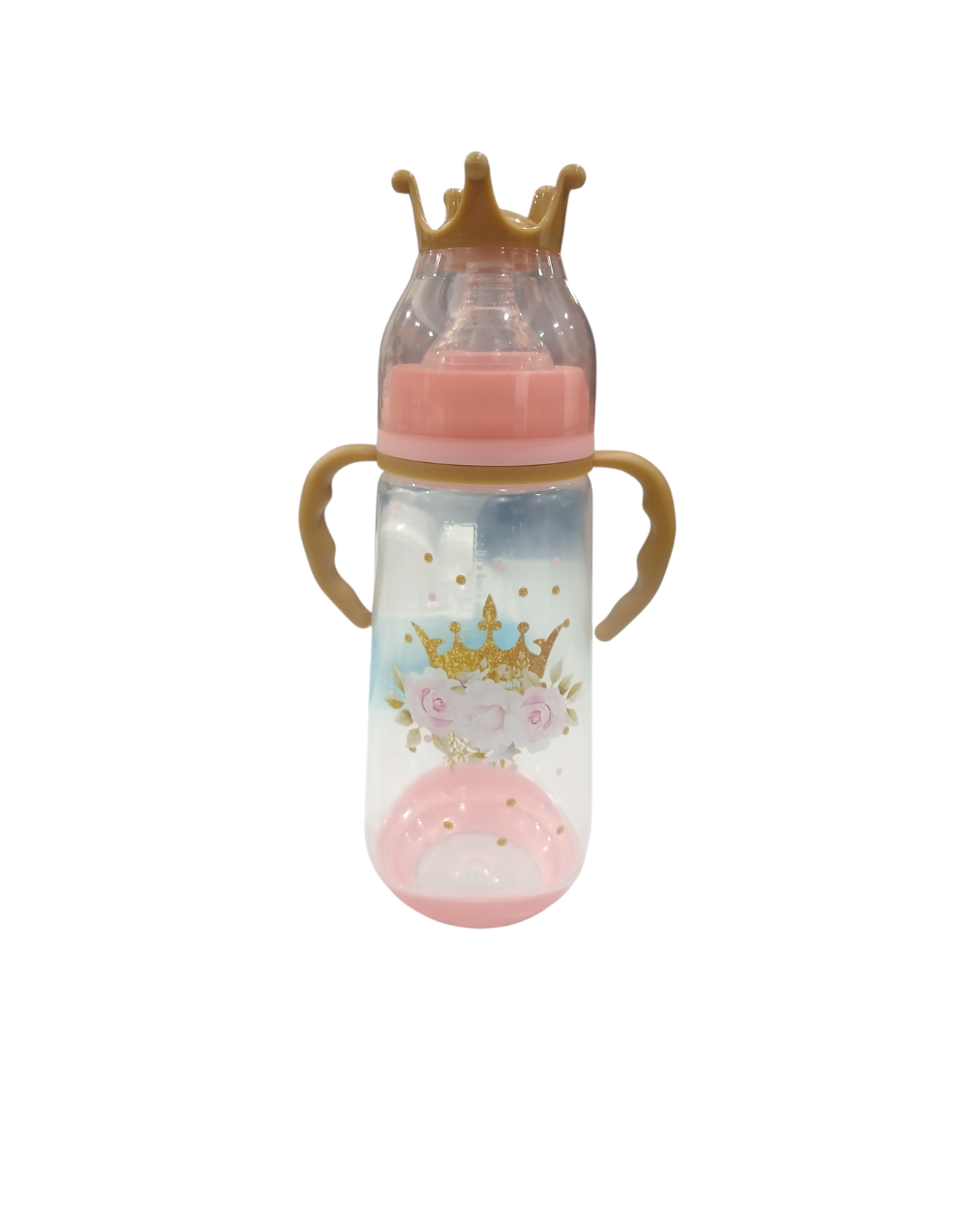 • El cuerpo del biberón está decorado con motivos de flores y una corona, manteniendo una línea estética delicada.